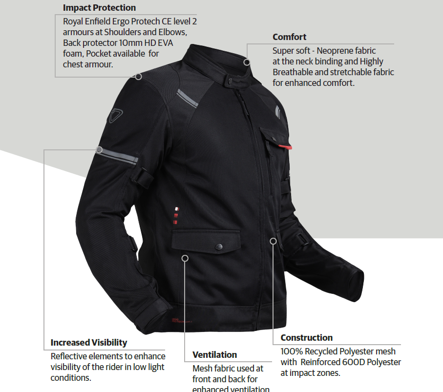 A retro-styled, sustainable riding jacket made from 100% recycled polyester mesh. Equipped with Ergo Protech CE Level 2 armour at shoulders & elbows, HD EVA foam back protector, and chest armour pocket, it delivers protection, durability, and eco-conscious performance.
